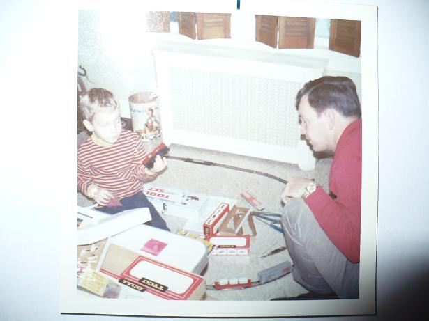 I scanned this old, faded 110 picture of my father and me assembling my first train set. The year was either '69 or '70. Notice the Tyco red boxes, a Swift reefer, and a GN culvert flat. We must have been using my new "Handy Andy" tool set to help with assembly (in the background). Seems that it's not only the trains that are "Vintage" now!