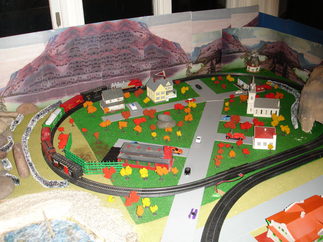 On the West side, two trains running in opposite directions.. Of these structures, some are new, some were part of the gift and there is one house (it has a thatch roof) that I bought at the Potter's Heron hotel in Hursley, England about 20 years ago. The cookie monster was added by my wife.