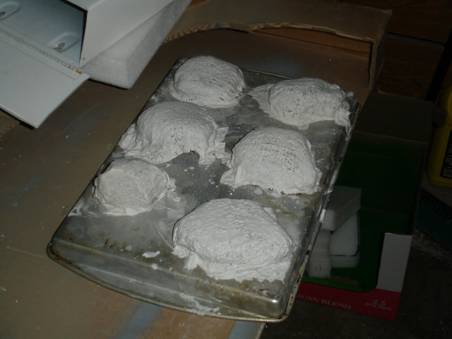 Rather than use real rocks, I took each of the rocks, put some plastic wrap used to cover a food disk, covered that with plaster cloth.