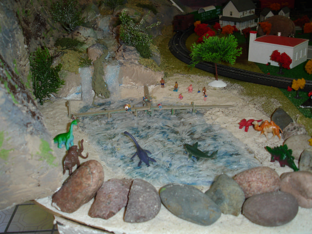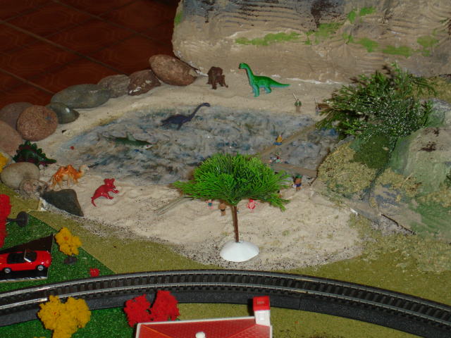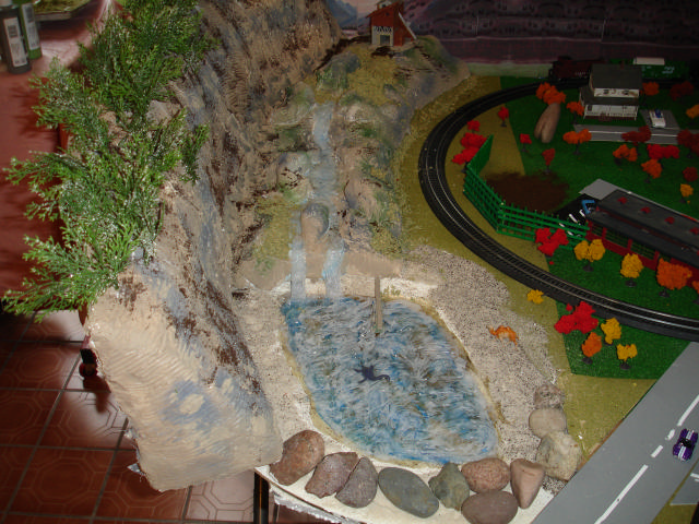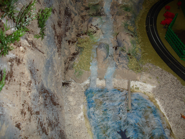 This is a view from the right side - a mine shack will sit on the top level. The water comes from an underground spring that comes up from below a rock on the middle level and then flows downward between the rocks.
