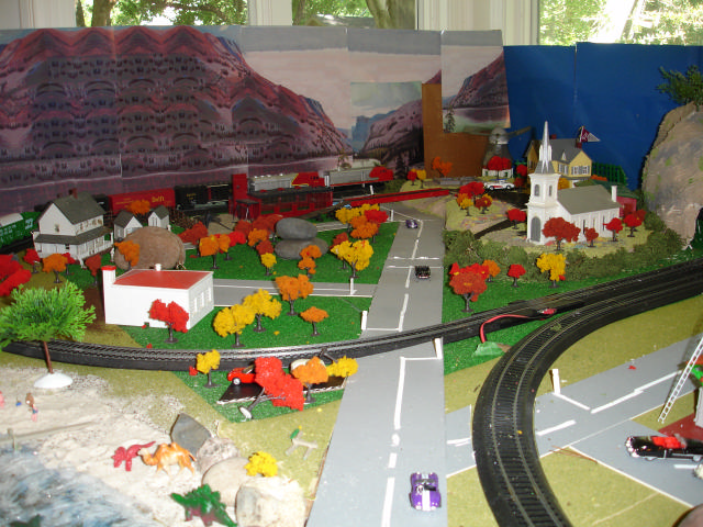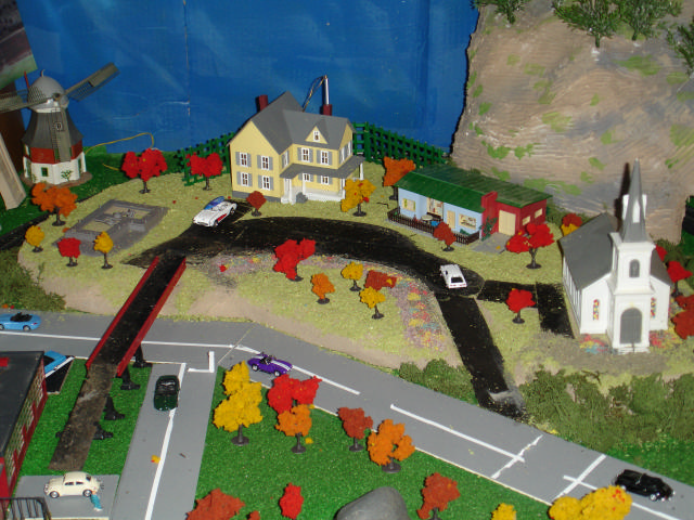 On the West side, two trains running in opposite directions.. Of these structures, some are new, some were part of the gift and there is one house (it has a thatch roof) that I bought at the Potter's Heron hotel in Hursley, England about 20 years ago.
