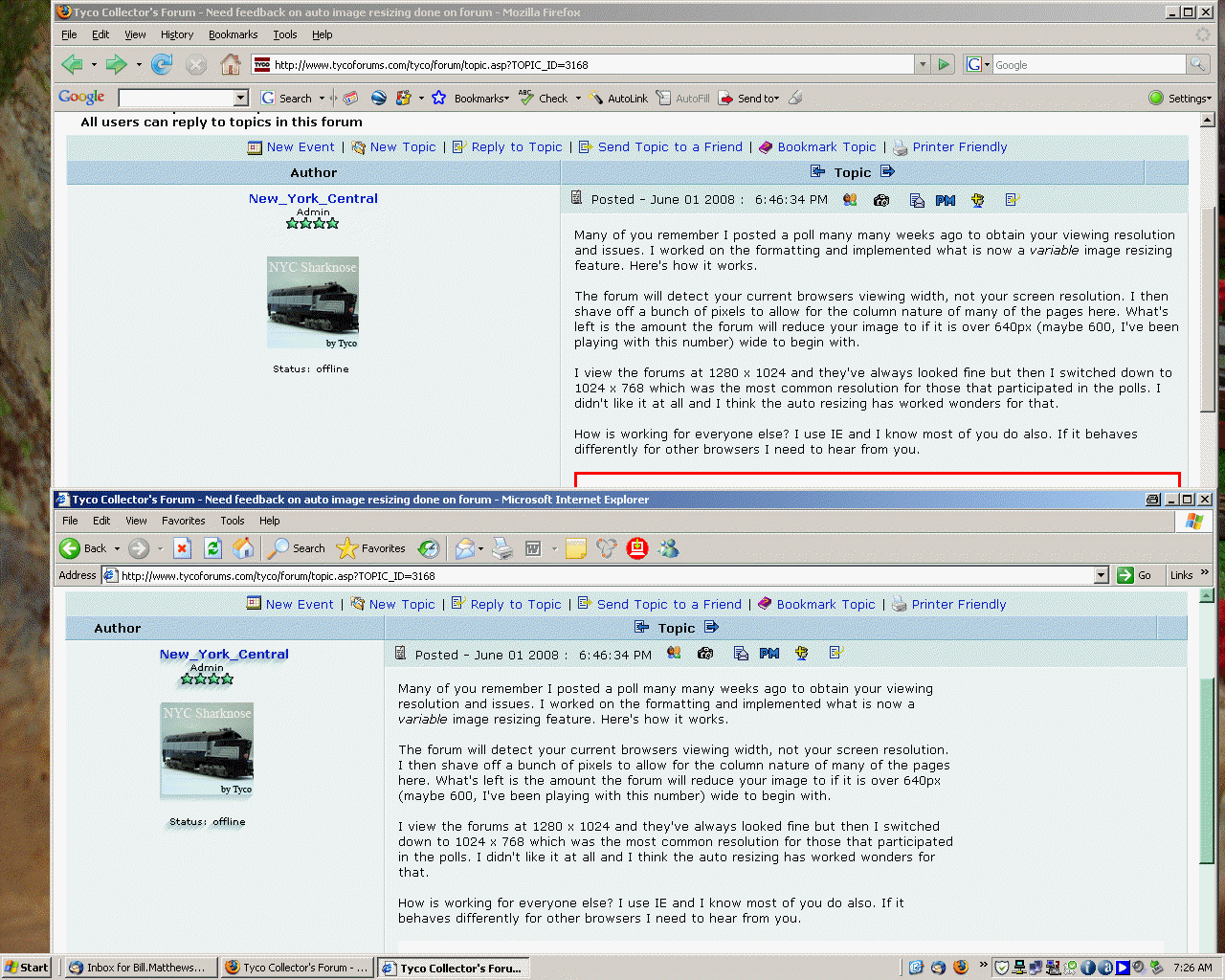 The browser in the back is Firefox - and the dividing line is at the "c" in "Reply to Topic". Also, with Firefox, the image in shaygetz's signature line does not display.