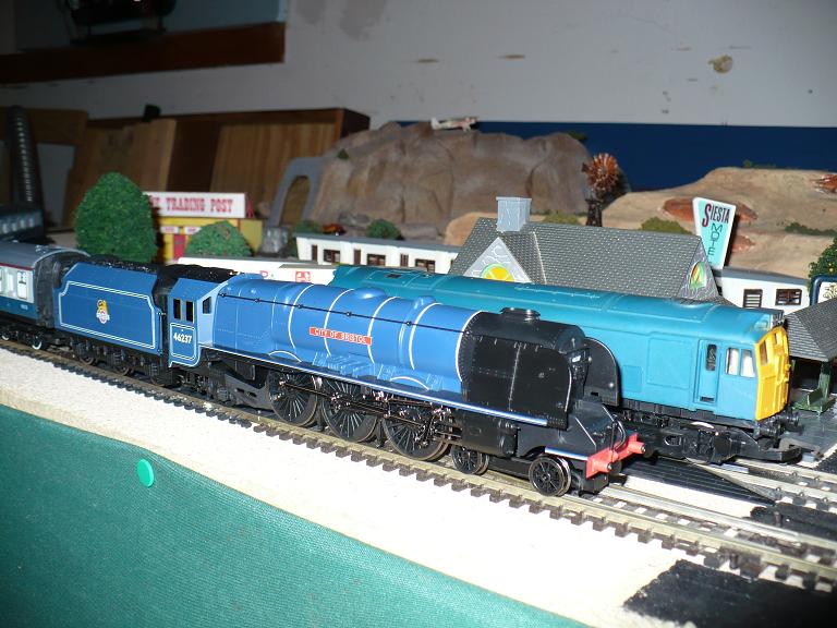 British invasion! Touring my layout is my new Dutchess (Coronation) Class 4-6-2. It began as an LMS streamlined loco in the 1930's...was later de-streamlined, and painted British Railways blue. Behind it, you can see a Class 25 BR diesel. All thanks to Ken!