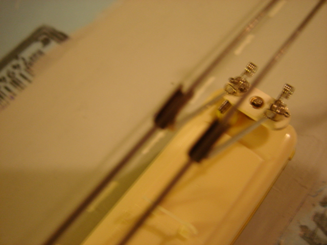 Hey guys. I'm trying to get a trolleybus system set up on my layout but I'm having some trouble. The poles I'm using are made of a flexible plastic and are bending from side to side everytime the bus goes by. I'd like to scratchbuild some poles out of brass wire, similar to the trackside poles shown on 2guyzandsumtrains. The only problem with this though, is that building the pole's arm out of metal would allow power to travel between the 2 wires. The wires travel through small metal tubes attached to the poles. I need to figure out a way to mount the tubes on the poles' arms, while keeping electricity from travelling between the 2 wires via the metal street pole.