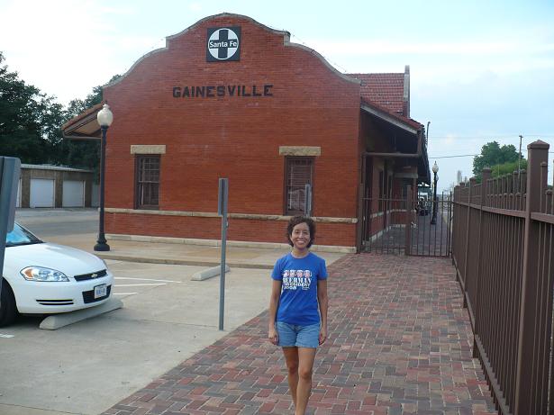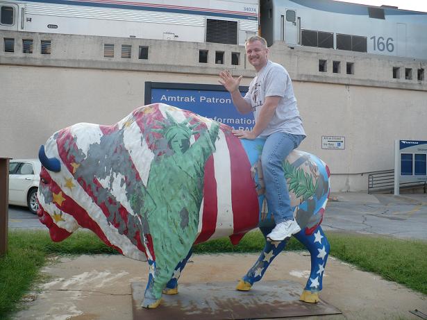 Hello All--My wife and I took a short weekend trip from Gainesville, Texas to Oklahoma City, where we had a night out while the kids spent some time with the Grandparents. Here are a few photos of the train-related portion of the get-away. Pics include the Gainesville station, OKC art deco-style station, Superliner interior (plenty of seats available!), and an inexplicable pic of me riding a patriotic bison while the train idles behind and above me. The 'Heartland Flyer' traverses the same Santa Fe line as the old 'Texas Chief.'