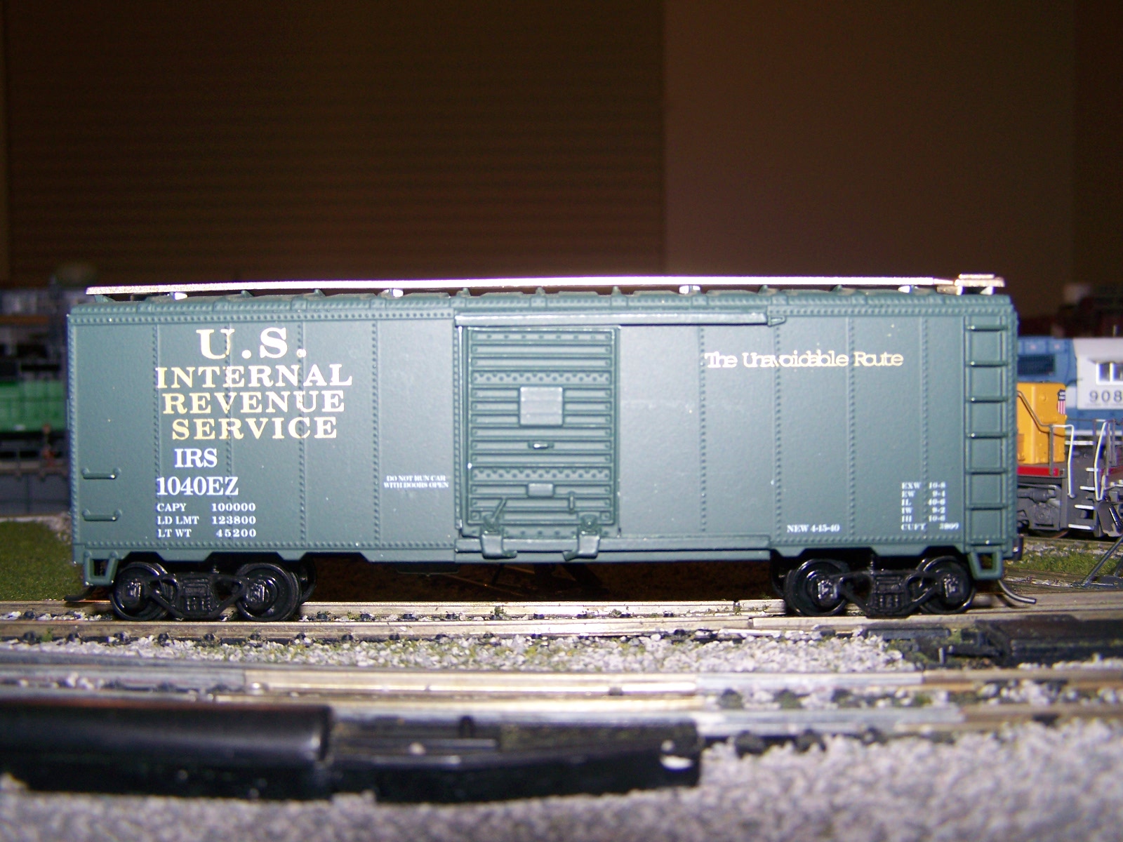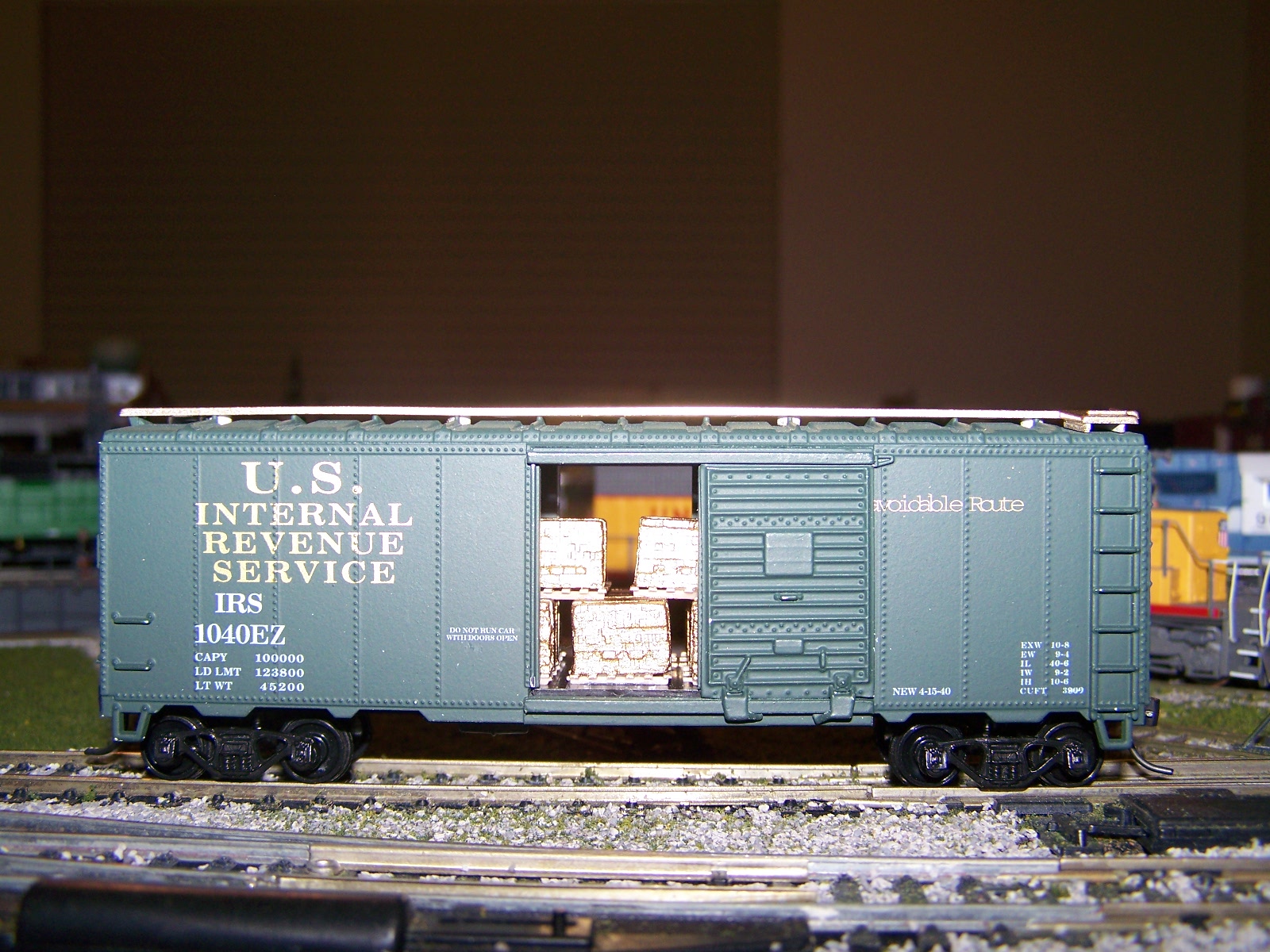 Hi All, I wanted to share photo's of an interesting car I recently purchased. It's from Greenway Products, an Athearn box car custom painted. This one is for the IRS, the Unavoidable Route. I used several pallets of bricks painted gold to simulate the gold bar load. I'm planning on adding a few security guards later.
