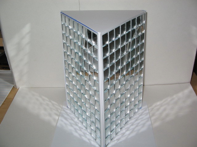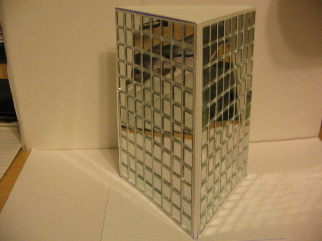 I have been working on this on and off this week. It is a glass tile sky scraper made from real glass tiles and styrene plastic. I am currently working on several other designs. Since no manufacturer is building or producing these-i am. There is a demand. The price on these won't be cheap if i sell any as they are time consuming. Currently-i have 2 hobby shops that will attemp to sell these. This is the first bldg completed. I have a larger glass tile that i am still working on--waiting on parts to finish. This one is not finished as i am going to paint black between the windows and gray for base.