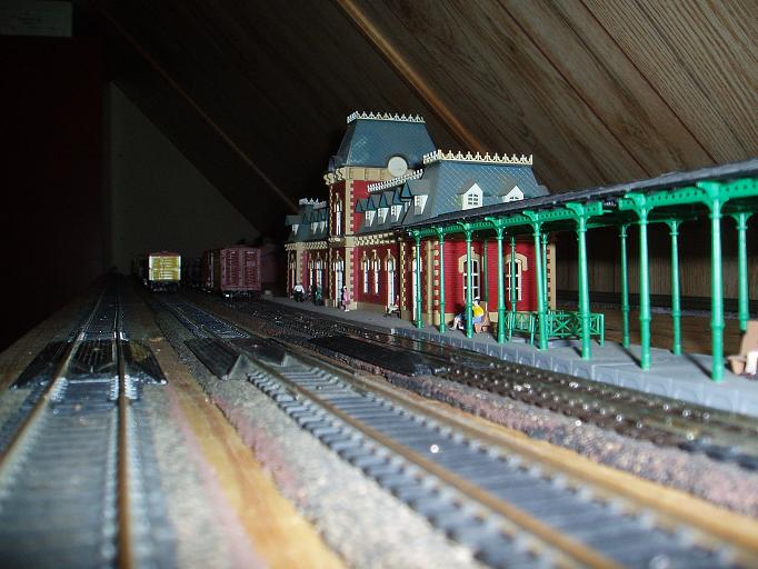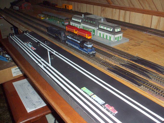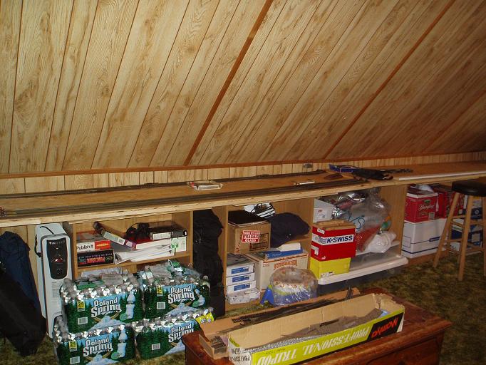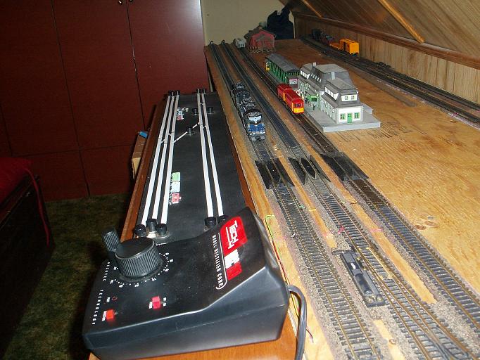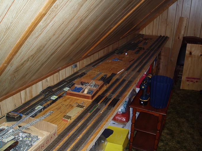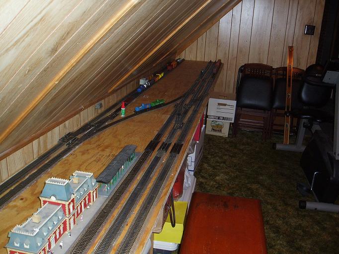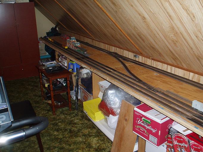 Carl : Thank you for the comments. You can see this is not the most conveint of spaces to locate a layout. My last layout was large and was their for a long time. I kept changing it as is normal. Just it was in a basement for a 5' 10" person. I'm 6' 2" So I would find myself on the floor at times waking up or just bleading. Now in the attic all I have to worry about is the angle of the ceiling. Walking into that just rubs your head. I'm sure going back and forth will get old fast. These two 2' x 8' sections just sit atop 3 shelving suports and a old 3 draw desk. The sections will be removable and I hope added to another layout somewhere. frank