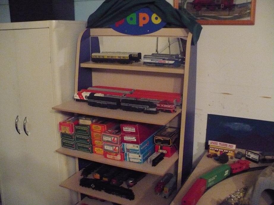 Hey Folks, Here are a few pics of my living room train displays. They used to be pic-a-nut shelves holding little cardboard boxes of nuts,and bolts. I repainted them to display my Matchbox,and Hot Wheels car items. Then one day I realized that my HO equipment fit perfectly,so down came the cars,and up went the trains. Does anyone else use a similar setup?