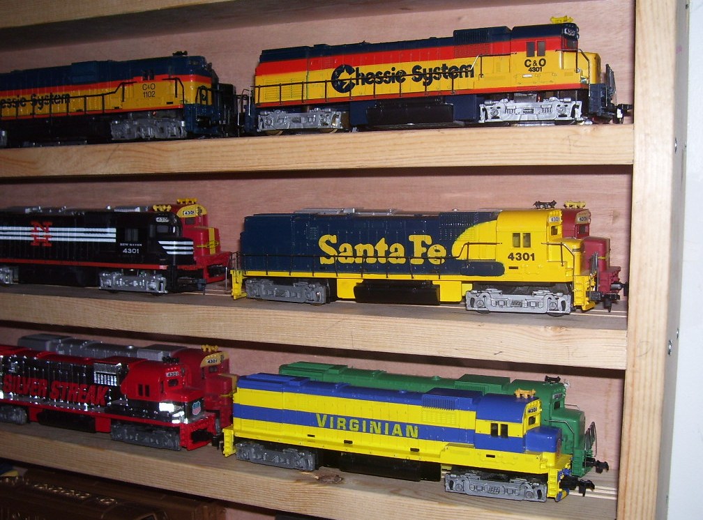I'm sitting here ready to go to church and saw this post. I made a shelf from 1" x 4" s and luan backing that is 2' x 6' and hanging and in use but no finish has been applied. I have 7 shelves available if I use the top of the frame. I put saw kerfs down the middle of each shelf to fit the loco wheels. There is room to put 2 locos on each shelf if I want but that's tight. I'm only showing a partial shot because it needs cleaned-up a tad. My shelf is in the basement.