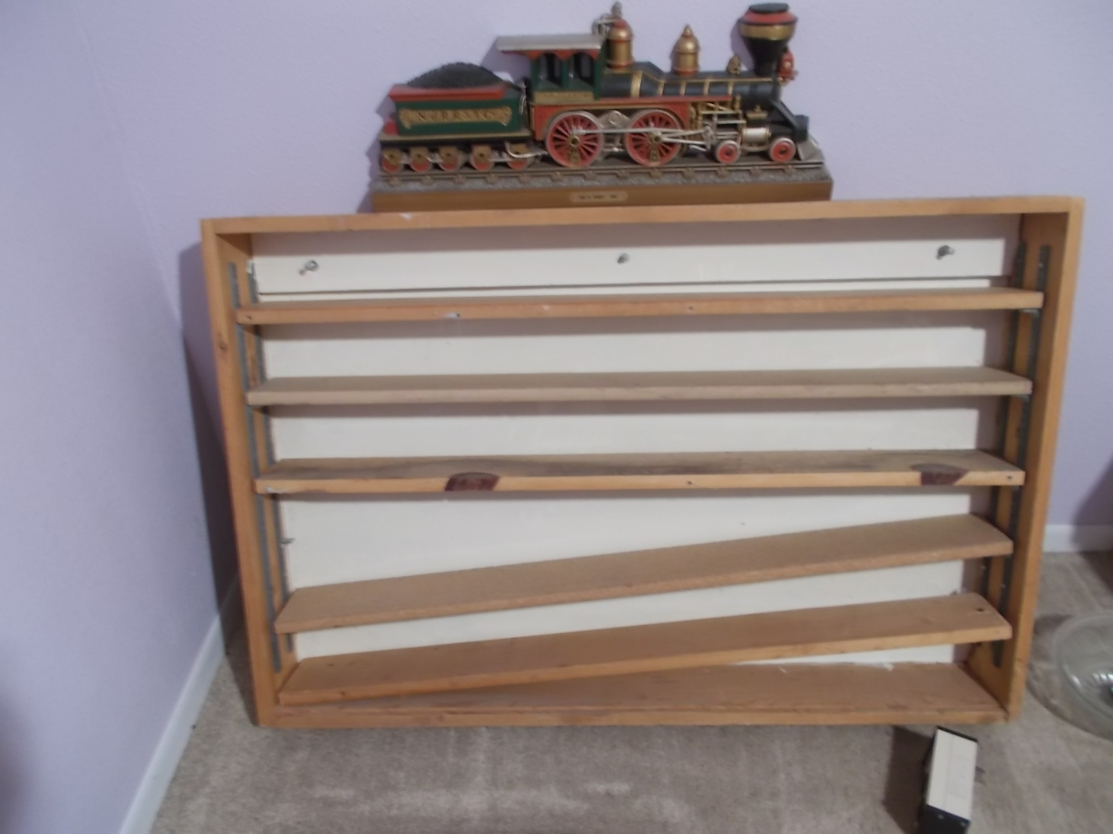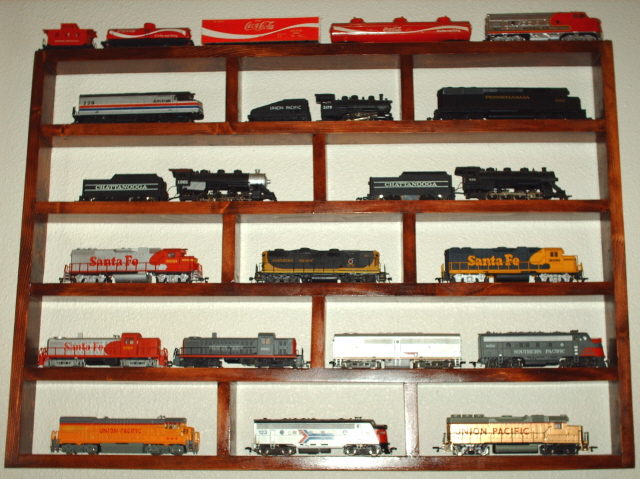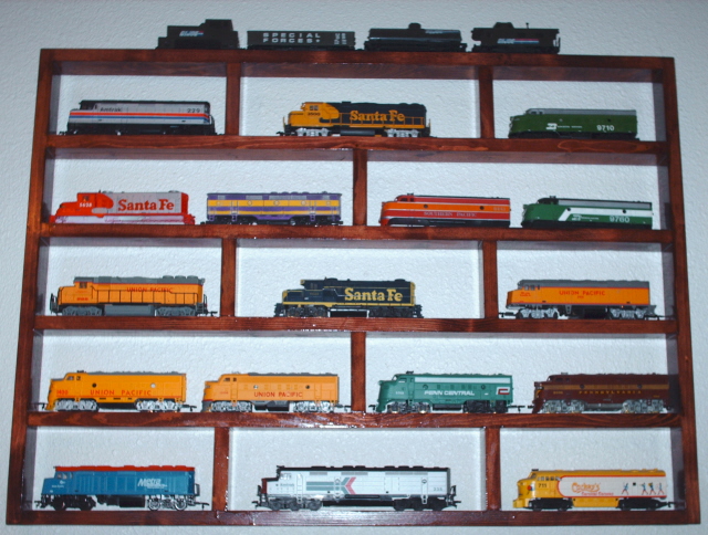 Here's mine--1x3's screwed together and stained, with masonite back. In the middle is my newest addition, the Chessie F-9.