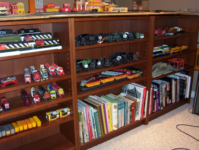 I picked up 5 book shelves from Ikea's scratch and dent section for $30 each. I am in the process of building a layout partially on top of them so I can display my trains and books.