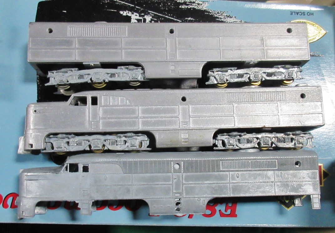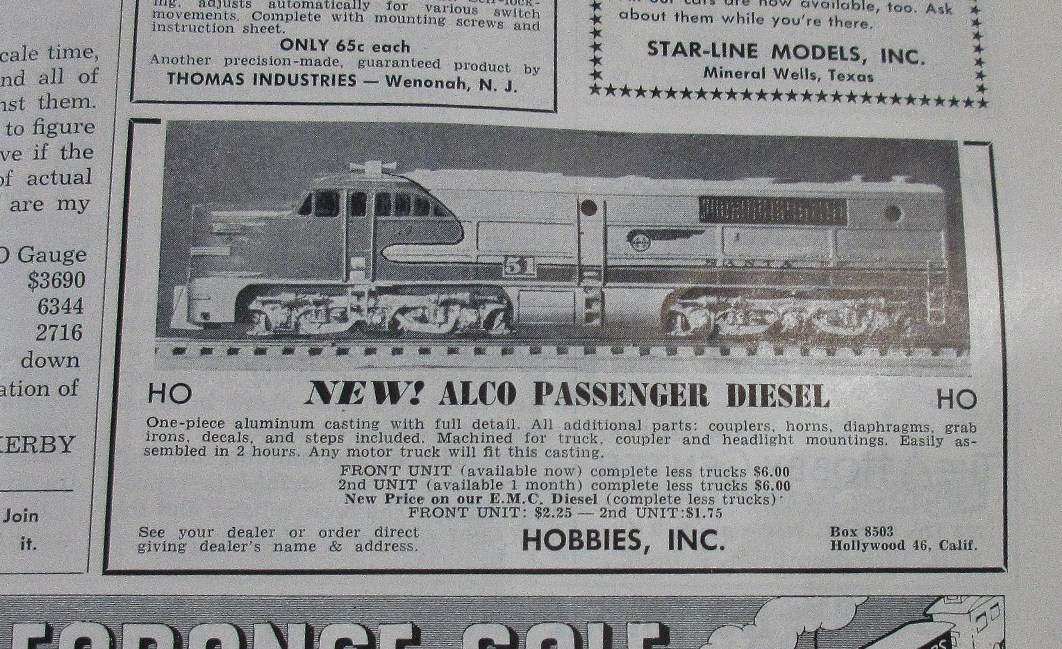 This may not be fair. The manufacture was around for only a few years, and this Alco PA1 and PB1 advertised maybe for only 2 years or so. The bodies are die cast, neither is powered though at the time they came with power drives. Lindsay drives. Both have the proper trucks and they are Lindsay. The other die-cast PA1 at the bottom is a Lindsay one there to compare castings which are different. A hint is they were made before 1950. * castings in question are the PB1 at the top, and the matching PA1 in the middle. frank