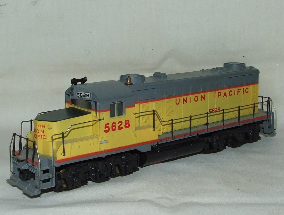 Back to Tyco. A common SF GP20 with handrails from a Mantua shell and Alco truck sideframes.