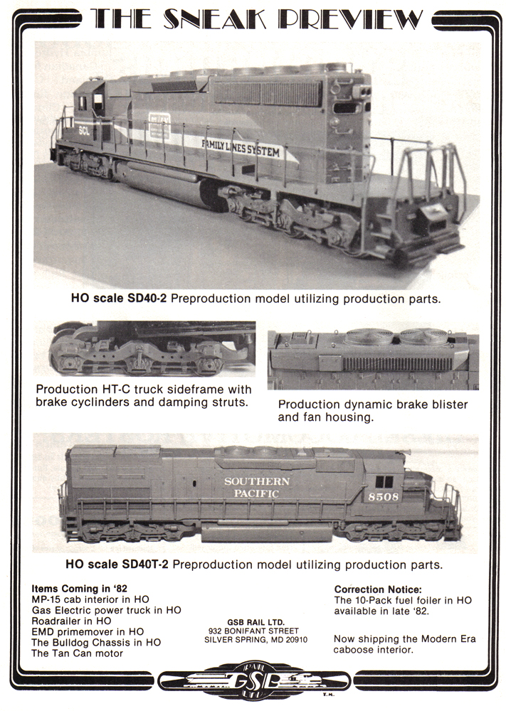 Above is a May 1982 Model Railroader magazine ad for the then-new GSB SD40-2.