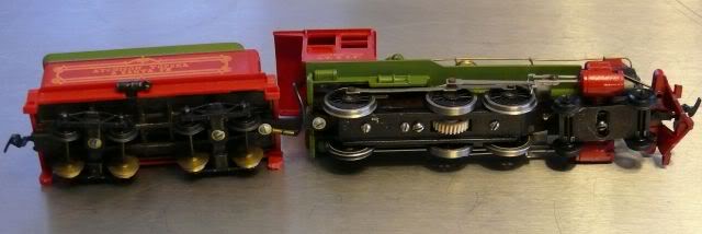 I dug this one out of a shoe box & noticed I can't find a maker mark on the underside. It is primarily metal, tender sides & engine cab are plastic. It has the old style 'slot car'?? motor. Pick up appears to be the brass wheels on 1 side of the tender. Which bothers me as the tender body sways like a palm tree in a good wind. Which may explain why it runs quite erratically. Speeds up/ slows down unassisted. Any ideas on who made it/era/ & how to get it running more smoothly? Thanks Tanked