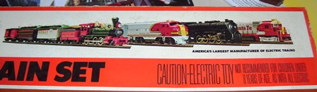 I came across this set at a yard sale ($10). I originally thought it was all one set but now have come to think that it is parts of diffrent sets. It has the follwing parts Twin Disel Engine Santa Fe 4015 328-22 40' Caboose Santa Fe Operating Crane Car With Boom Tender 50' pulpwood car Southern #334 A Tripple Dome Tank Car Gulf 357 B Plus Some Track and Transformer
