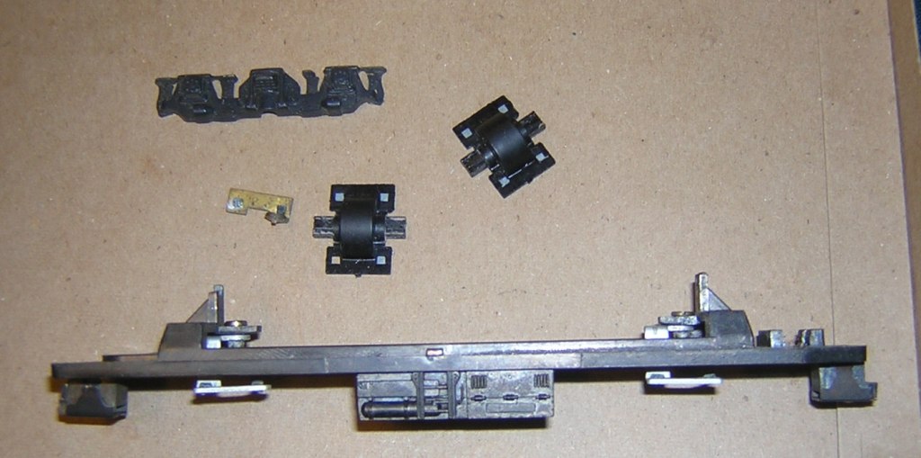 Try to do this in groups. First off, it seems I have placed some in an alternate location, so I will be looking a bit later for them. This one, A and B unit, 0565 and 0575, single power, but that makes no difference, as they came to me in pieces, along with all the rest. Interestingly, the A unit has Blombergs, and the B unit has Flexicoils. The one shot upside down of the rear truck shows the easy fix for broken tabs. Drill the end, very short screw. Did that years and years ago.