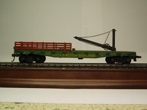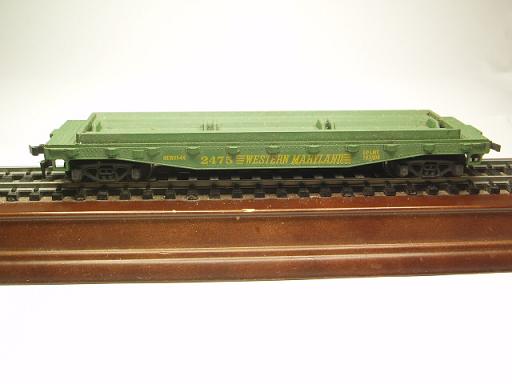 Erich : Like you were told the Western Maryland Skid Flat are very common here. Also the lettering is different. It comes in two or three versions. I have two, one of which you have seen allready. That Lettering was also used in a altered version on a plain flat car. It was a crane car.
