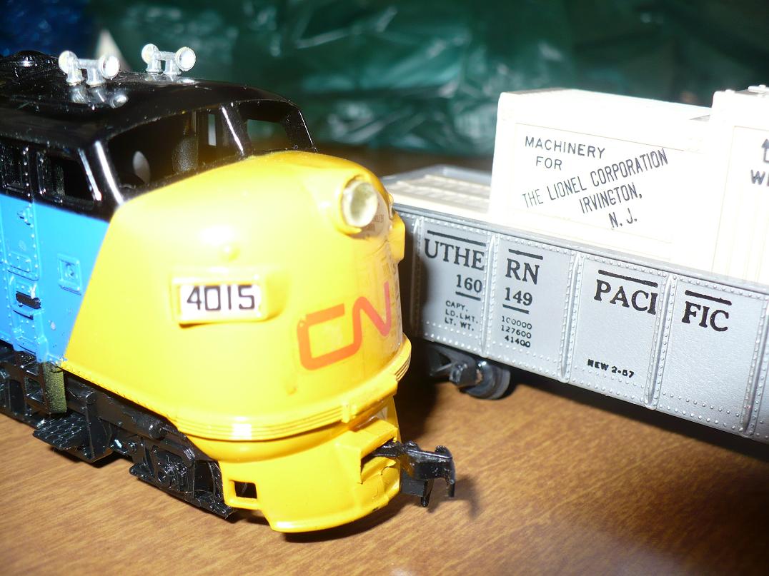 Hello All, Maybe someone here can elaborate on my finds today. They seemed to have some collectibility, and although I didn't need these specific pieces, I thought I might sell them here if there's any interest. If not, they're still pretty neat! First is a Tyco PT CN/Via like new, next is an Athearn UP GP-30 dummy--but I know the shell will fit on a common GP-35 frame. Finally is a Marx SP gondola, with a load that says "Machinery for the Lionel Corporation, Irvington NJ." I'd especially like to know more about it.