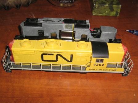 The CN GP18 is a Life-Like Proto-2000, I forget what they called the Canada arm but they had a different name. Might bring some bucks on eBay, that's an oddball paint scheme. Clicking is probably cracked gear syndrome, Wathers owns the line now and should provide parts for it. Gears can be removed from the bottom by popping the bottom plate off the trucks and the gear and axle comes out as an assembly. May need to gently spread the truck sideframes to remove it (best done by gently rotating a screwdriver blade between the sideframe and truck tower near the center pin).