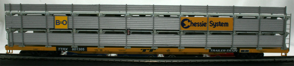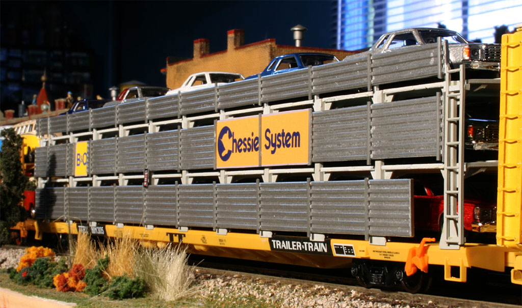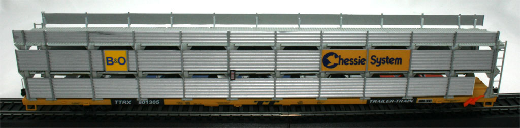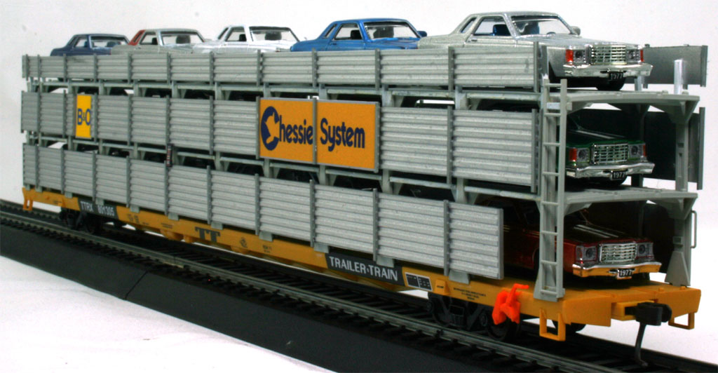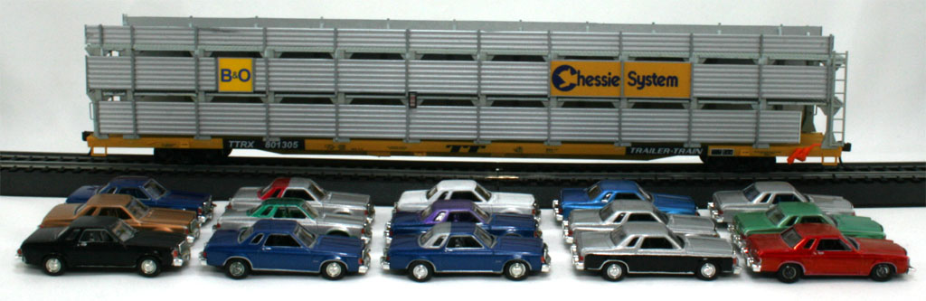 1) Bi-level, STC, VW Vans (will trade out for Ford E-100's at some point) 2) Tri-level, STC, VW bugs 3) Tri-level, L&N, AMC Gremlins 4) Tri-level, CPRail, AMC Pacer (under construction. Might put "chickenwire" sides on it to mimic the last open autorack I ever saw: a CPRail rack in the BRC yard in Chicago, hauling Ford Explorers... in 2003!) 5) Tri-level, BN, Ford Pintos (under construction) 6) Tri-Level, B&O Chessie, Ford Granadas, paneled 7) Bi-Level, C&O, Dodge D100 Vans (under construction) 8) Bi-Level, ATSF, Ford pickups (under construction; need to acquire old LifeLike trucks) 9) Tri-level, B&O Chessie, BRASS (custom painted by me) enclosed sans roof, Chevy Citations