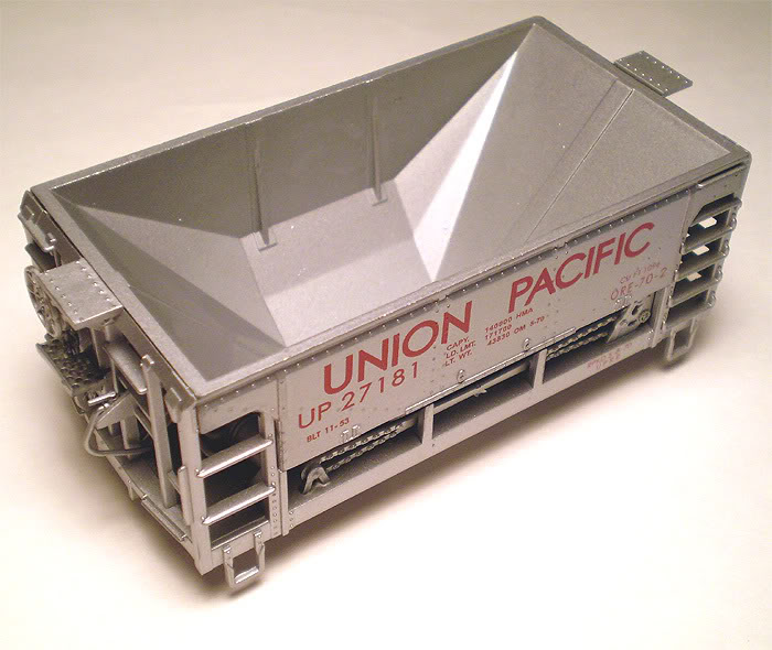 UP built many of its own freight cars at Omaha, so the UP car may or may not be correct. UP did paint at least some cars silver as shown by the MetalTrain example. Lettering may have been black, rather than red on actual examples. However the red lettering may be right.