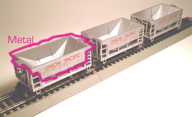 The cars are not totally constructed of metal. The ore bin/hopper is the metal part of the car. The underframe base is plastic...