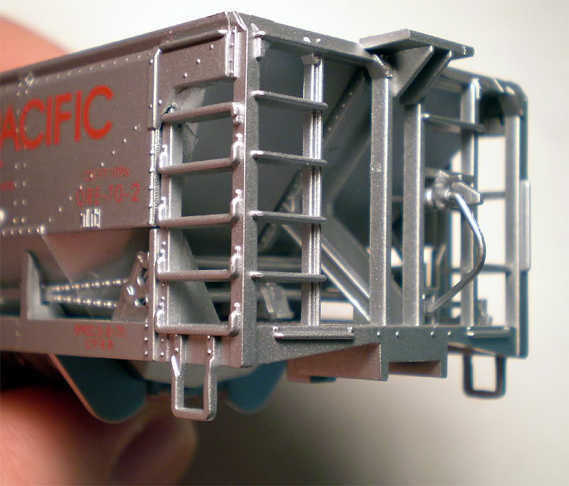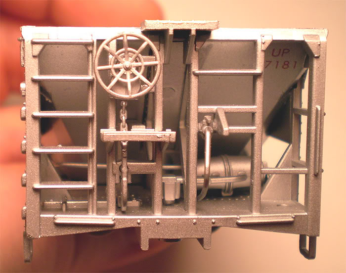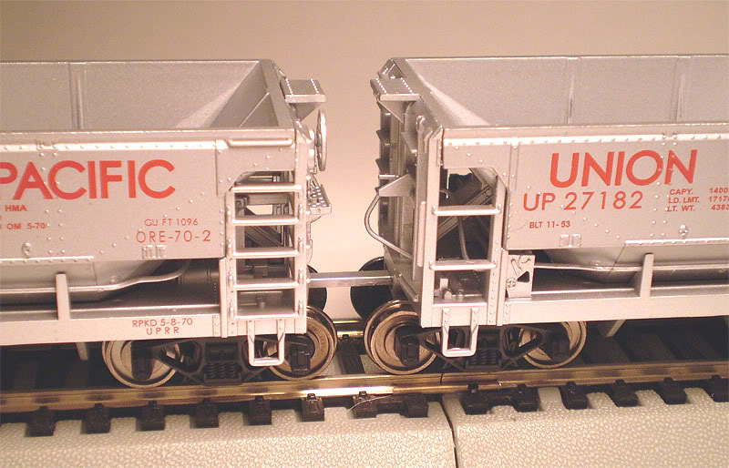 One other thing to note, I had one bit of trouble with my set. I could not at first get one of the wheelset screws to unscrew...it was stripped. The screw finally came out, but the threads of the screw were coated in plastic and thus the hole for it was useless to put it all together. It is a small screw and I plan to attempt to go with a slightly larger screw and see if that works. Again, this one Ore Car was dead-on-arrival due to this over-cranked-at-the-factory screw. So take care when putting together your cars. I plan to toss the drawbars and put in Kadee Scale Knuckles on them all when my 4th UP Ore Car arrives.