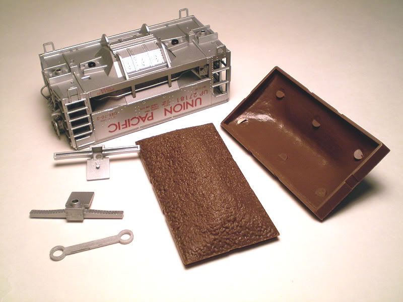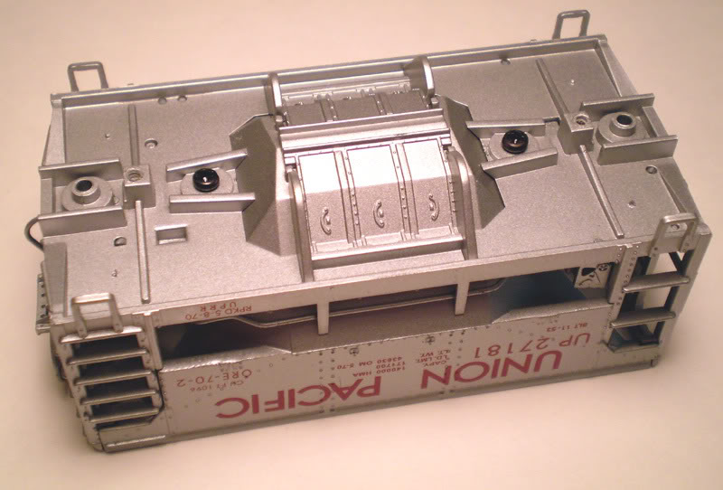 Here's the Ore Car on its back. Note the small black set of screws on just inside from the wheels are what holds the metal hopper to the plastic underframe.