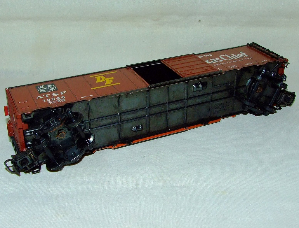 Had seen this one a couple times, wasn't sure of its origin. But now in hand I can clearly tell that it is factory Tyco paint job. But even more impressive, this car uses the rare original 50' boxcar tooling with unfastened wieght and smooth inner chassis - an easy sure date to 1968. The cars build date says as much too, a rare case where it actually has meaning.
