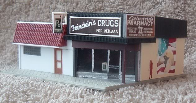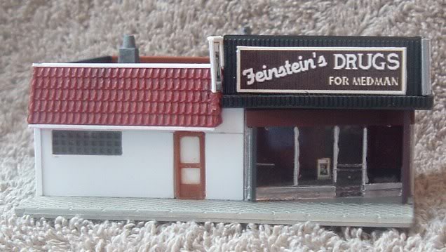 When a fellow modeler at another forum passed away just before Christmas, the idea of doing something to honor his memory was brought up. Knowing that pictures of his store were online, I looked them up and realized the Model Power N scale stores came pretty close to the right size, all that was left was a little guessimating and some creative kitbashing. My beloved provided the tech support for the graphics.