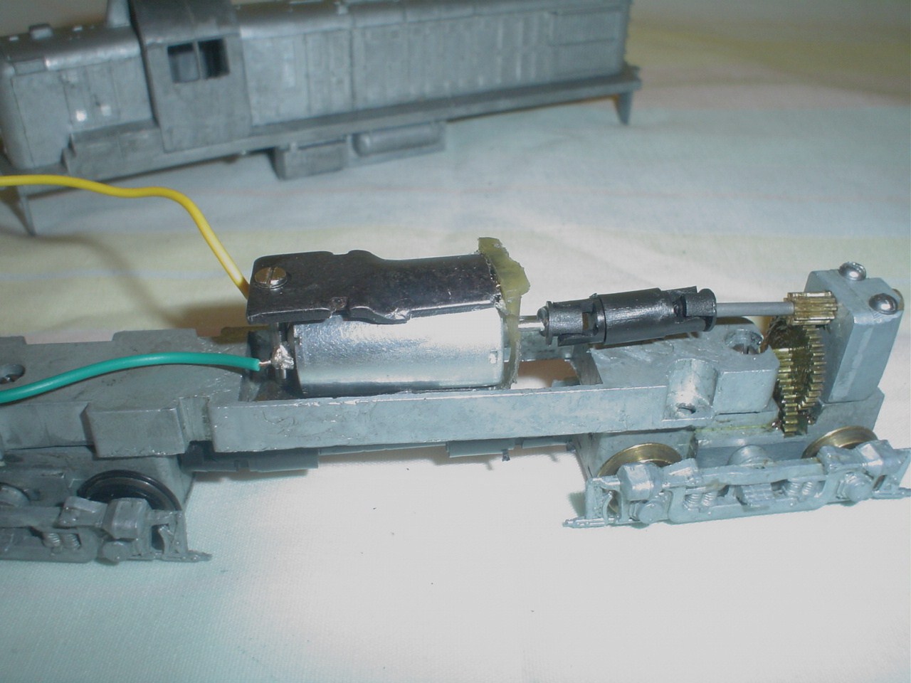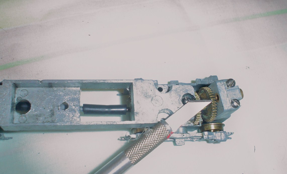 | well i found an old gear from an old kit and i rigged up some drive shafts, it runs real strong with a can motor lifted from a broken childs toy. the wieght of this rs matches the smooth can motor.next is brass handrail ect..