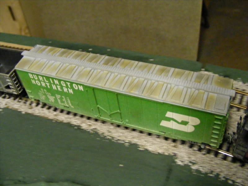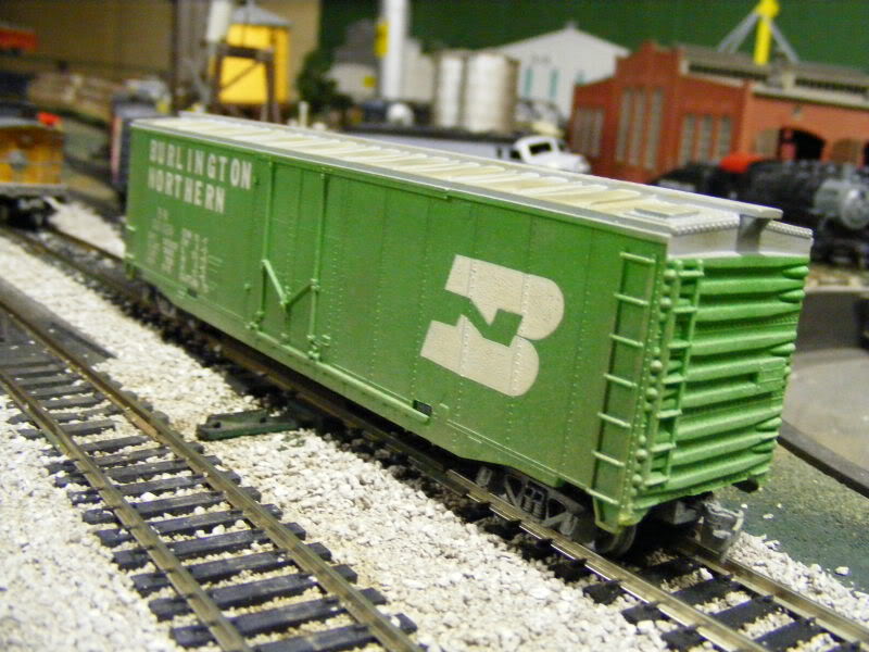 I have two right now. First off is something everyone owns at least 6 of, the green BN 50' boxcar. Mine keeps going though phases, its getting to a point where I'm starting to get happy with it.
