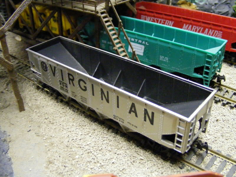 This one could probably use more work. But I really like the Tyco hoppers I think they are pretty good looking for their time. I wanted to give the effect the hopper has been used before. So the easy thing was just masking the lip and giving the inside a light spray. Which I later realized that would never be the case in real life lol. So this one will get dry brushed and chalked eventually.