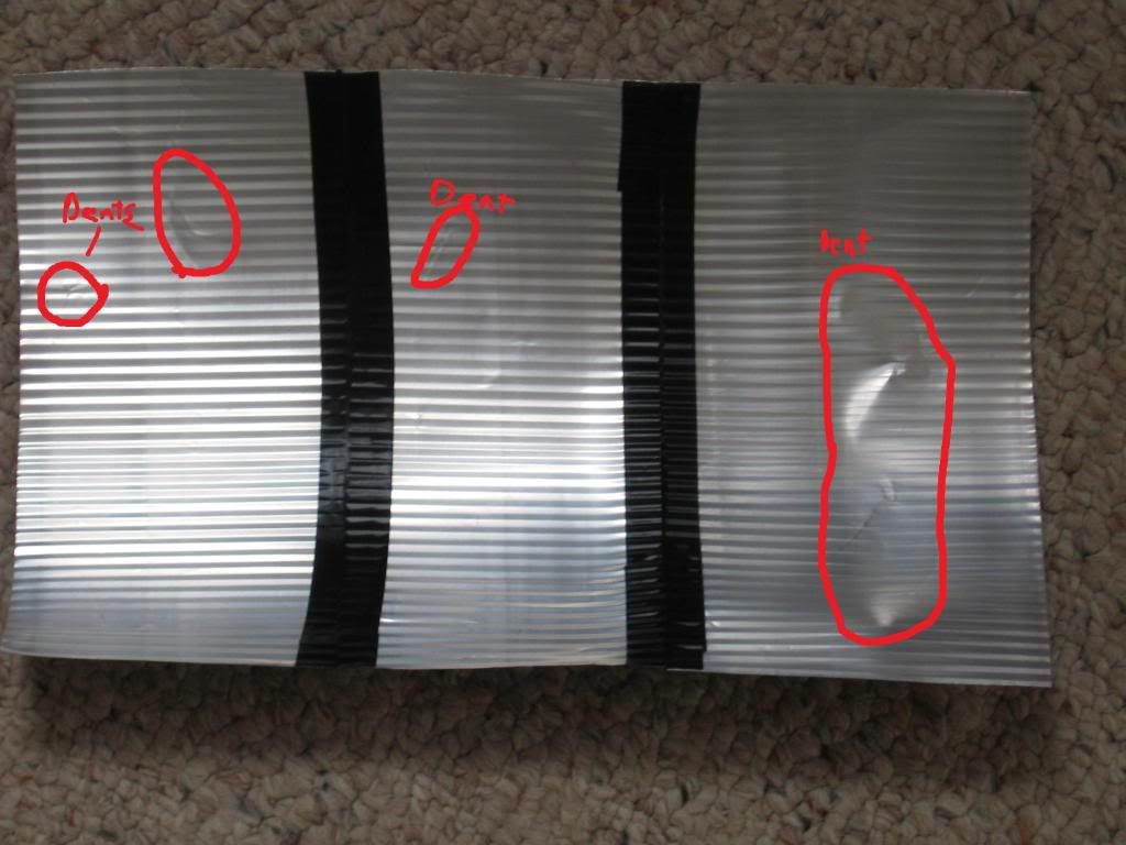 Several sheets joined together with electrical tape (the dents are circled):