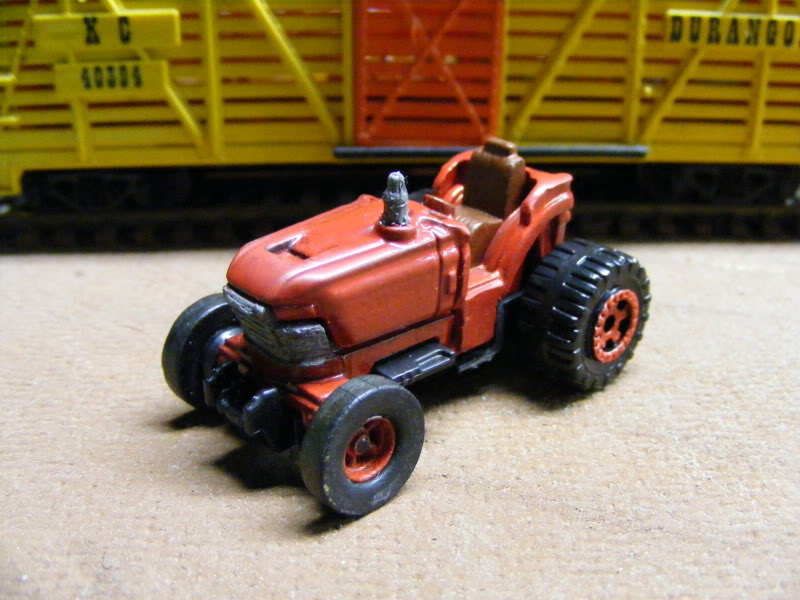 | Yup, anything white was diecast. Notice the steps are gone also, curiosity of a bench grinder. I used the cutting wheel on the dremel to cut the roof off, then a sanding bit to take care of the excess. Sanded what was left, and the paint did a really good job of covering in alot of the scratches so I got some help there. What really made a difference IMO was changing the colors around. Like making the grill a grey color. Color matching the wheels. And painting the seat & steering wheel was a huge improvement in looks over the molded plastic coloring. The whole thing also got a quick dark wash which really gave it that dirty farm use look.