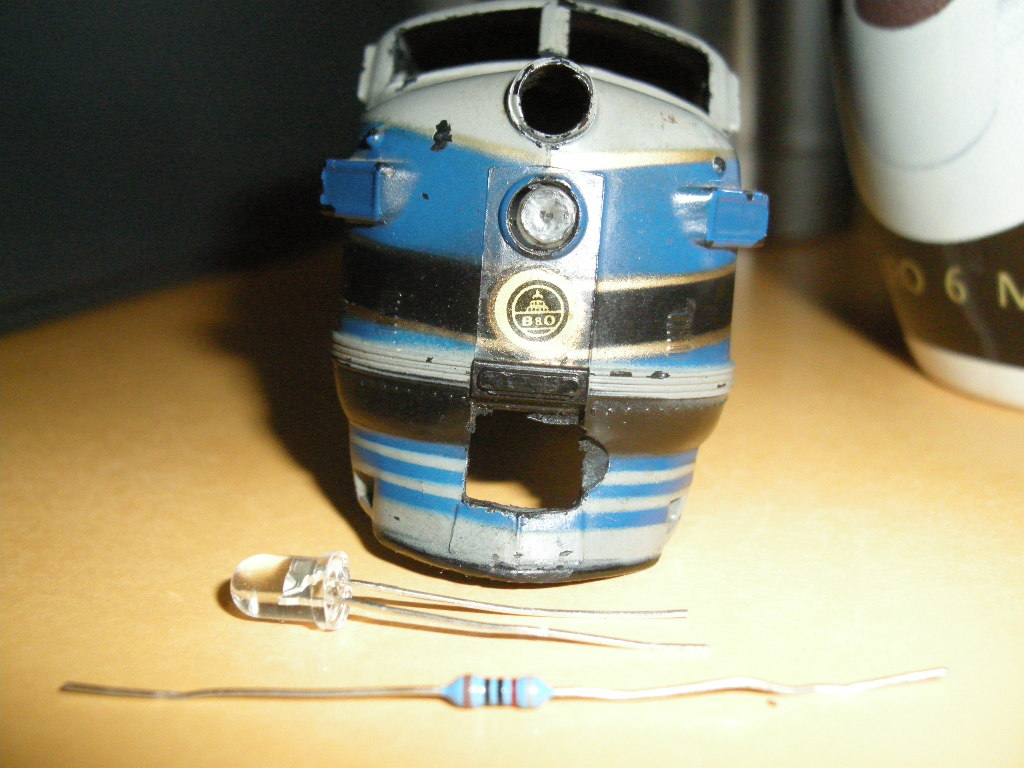 If your loco has lost headlight you can use a LED. a LED needs a resistor. the resistor has to be connected with the longer wire of the LED.