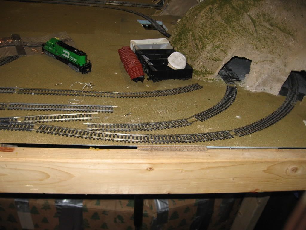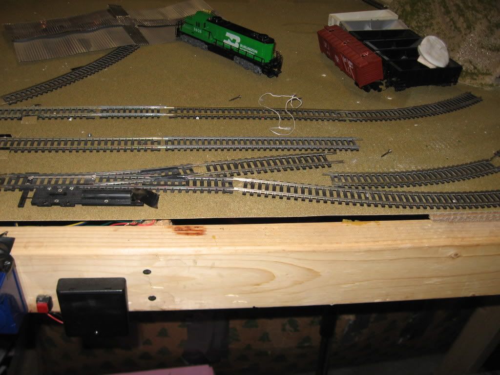 Hi, as I have mentioned before, my layout is more about fun and less about realism. I have an area of track with a turnout that curves too sharply for my Tyco locomotive. I tried modifying my old Sante Fe loco, but that didn't work too well . . . The piece of track coming from the mountain is another turnout, so that can not be moved. Unfortunately, it is almost at an exact 90 degree angle from where I want the track to go. I tried using some flex track, but it was still too sharp. If I can't firgure soething else out I will probably add a piece of a 4x4 and curve the main line giving me more room for my other line. So if you have any suggestions on how to arrange the track or how to modify my loco they would be greatly appreciated. Thanks in advance! Here's some pics: