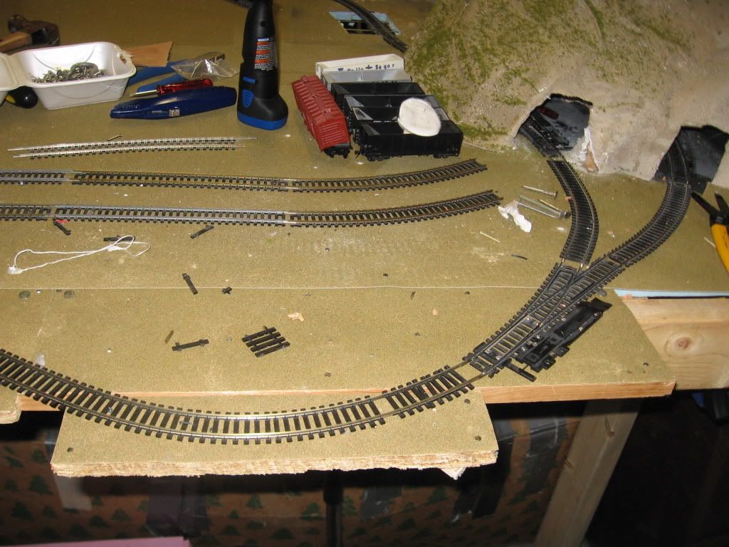 I don't have a permanent layout (phooey ), but with all my practice with floor layouts, I should have as good as a guess at this as the next guy. Change the switch to a right hand switch, keep the sectional track on the outside for standardization, and put flex on the inside between the straight leg and the inside-loop tunnel portal. This way should take the least amount of extra track to be bought and limited too-strange-for-words appeareance . Let us know how this all works out. But cutting a straight track short and adding a curved switch, if not too $$$ for you blood ( ) , just MIGHT work, but honestly, I've only ever used sectional, but I know of what flex can do...