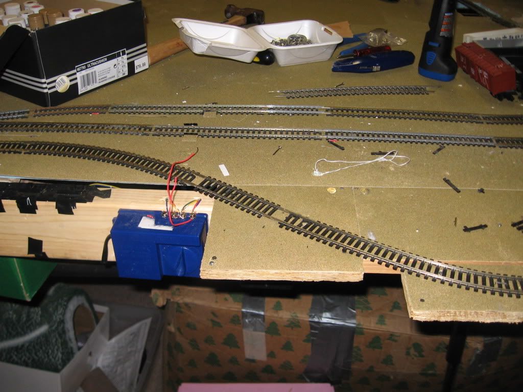 As usual, my train table has turned into a work bench. You can also see some stray wires, as I am getting ready to attach them around the track. I plan to use the space on the extension as a maintenence-of-way terminal.