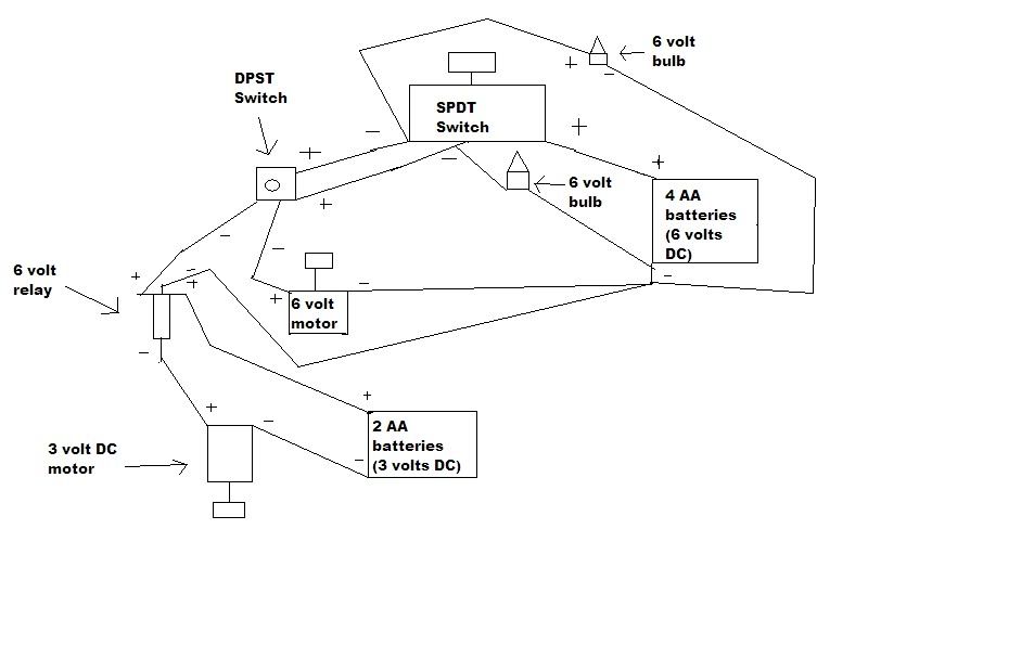 I want to be able to control them both with the same power source. One problem, though: one motor is 3 volts and one motor is 6 volts. I designed this circuit to control them both. I also wired in 2 flashlight bulbs so I know which accessory the switch is set to. If anyone spots any problems or has any suggestions they would be welcomed. The one thing I am worried about is the wiring of the flashlight bulbs. will all of the electricity just go through the bulbs instead of some of it going through the motor? I just need the DPST switch and then I can test the circuit. Here it is, you may have to look pretty closely to see it, for some reason some of the lines didn't upload correctly. ( I just drew it in paint and didn't bother to make an actual wiring diagram )