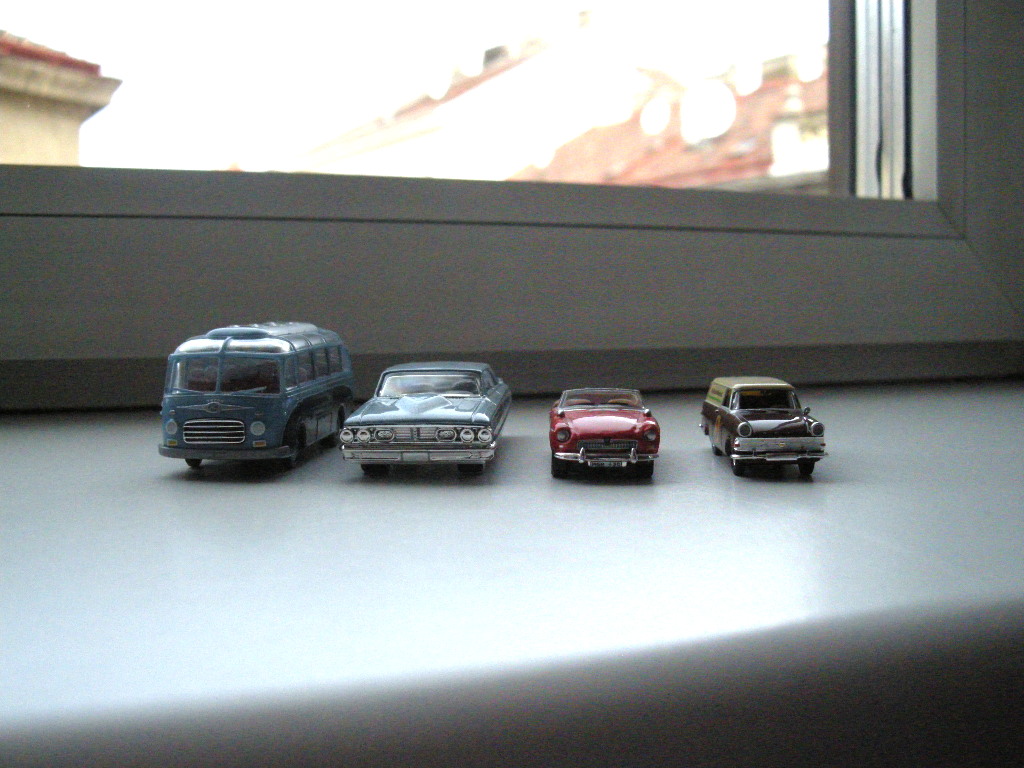 the bus on the left is 1/87, Hotwheel, red MG 1/72, the (big) Opel is 1/87.