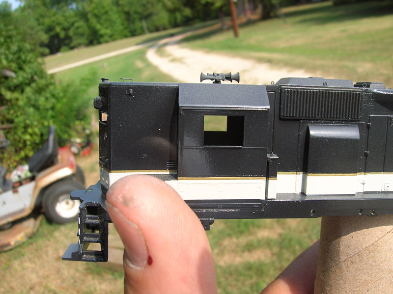 | boo-boo on posting the photos. These are two different units.The yellow diesel shell is a GP38. The black Southern diesel is an IHC SD35. It came as a low nose. That's a Cannon&Company high nose conversion. I'm not sure if I have a pre-conversion photo. Maybe I'll post a completed full length photo of it soon.