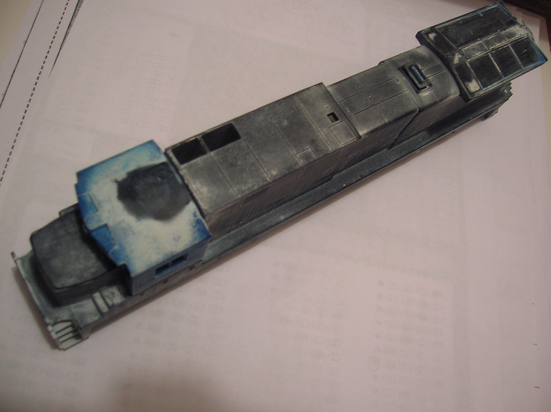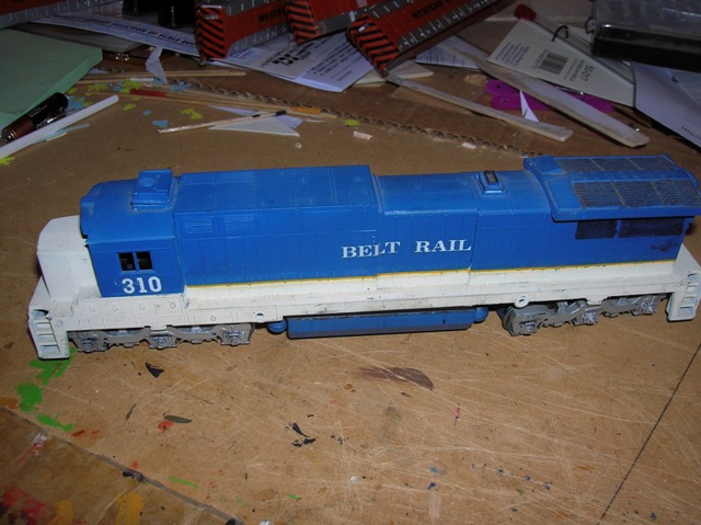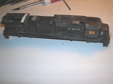 This is my C32-8 I got at a train show for $5.00. It does have a power chassis. First order of business was to remove unwanted details and strip the paint.
