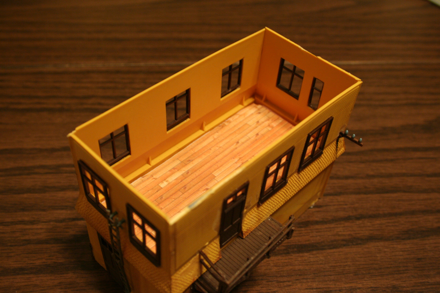 The floor is just an image of a wood floor printed off so the boards look about the right size. Next set of pics will hopefully be of the completed interior, interlocking and all, and some grass and trackwork on the layout itself!