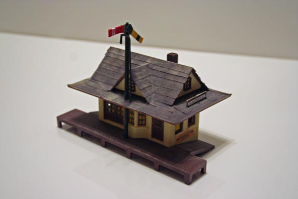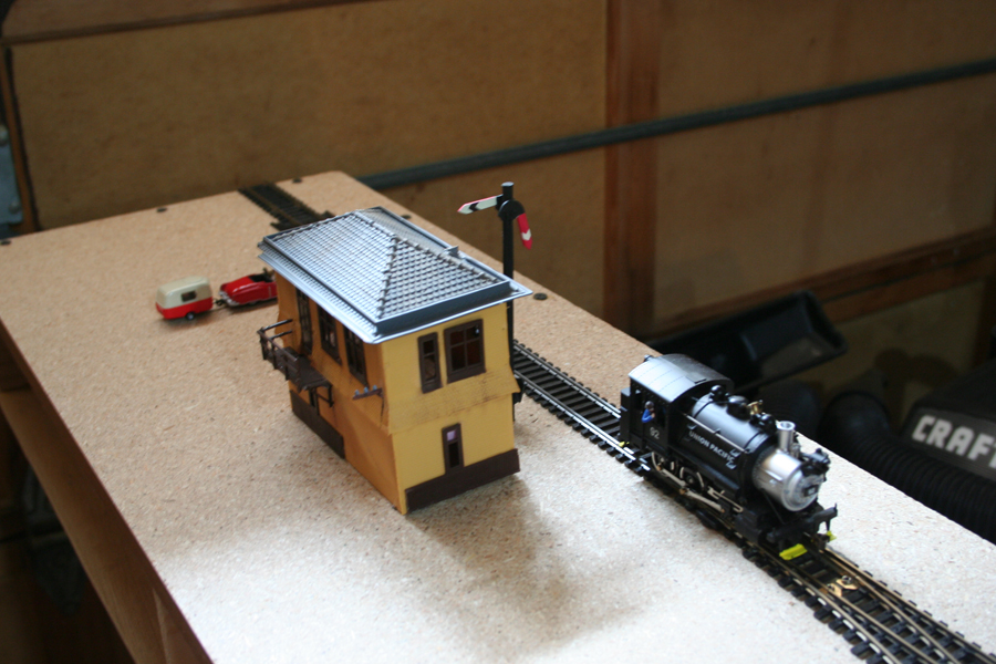 That's the Plasticville suburban station that I modified the roof on several years ago because I couldn't stand how flat the original hipped roof was. I just made a cardboard gabled roof that sat down on top of the middle of the plastic roof, and then covered it all with "tarpaper" made from pieces of black construction paper. It makes a nice whistle-stop small town station.