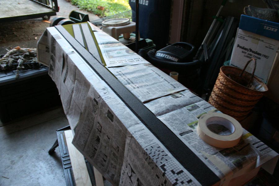 I got the road built today. The method I use for roads is from the May 1991 issue of Model Railroader on their "especially for beginners" layout. First I put down a layer of 3/16" foamcore, which is about the same thickness as the roadbed, followed by a top layer of 1/16" chipboard or illustration board.
