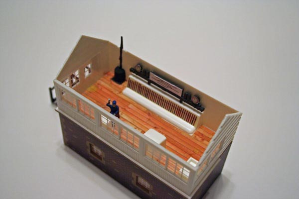 I did the same floor treatment as in the Tyco tower, and added a sitting Model Power figure. The level of detail in this British version of "Plasticville" kits is surprising. The switch levers were a decal included in the kit, and all the furniture was molded into the floor.