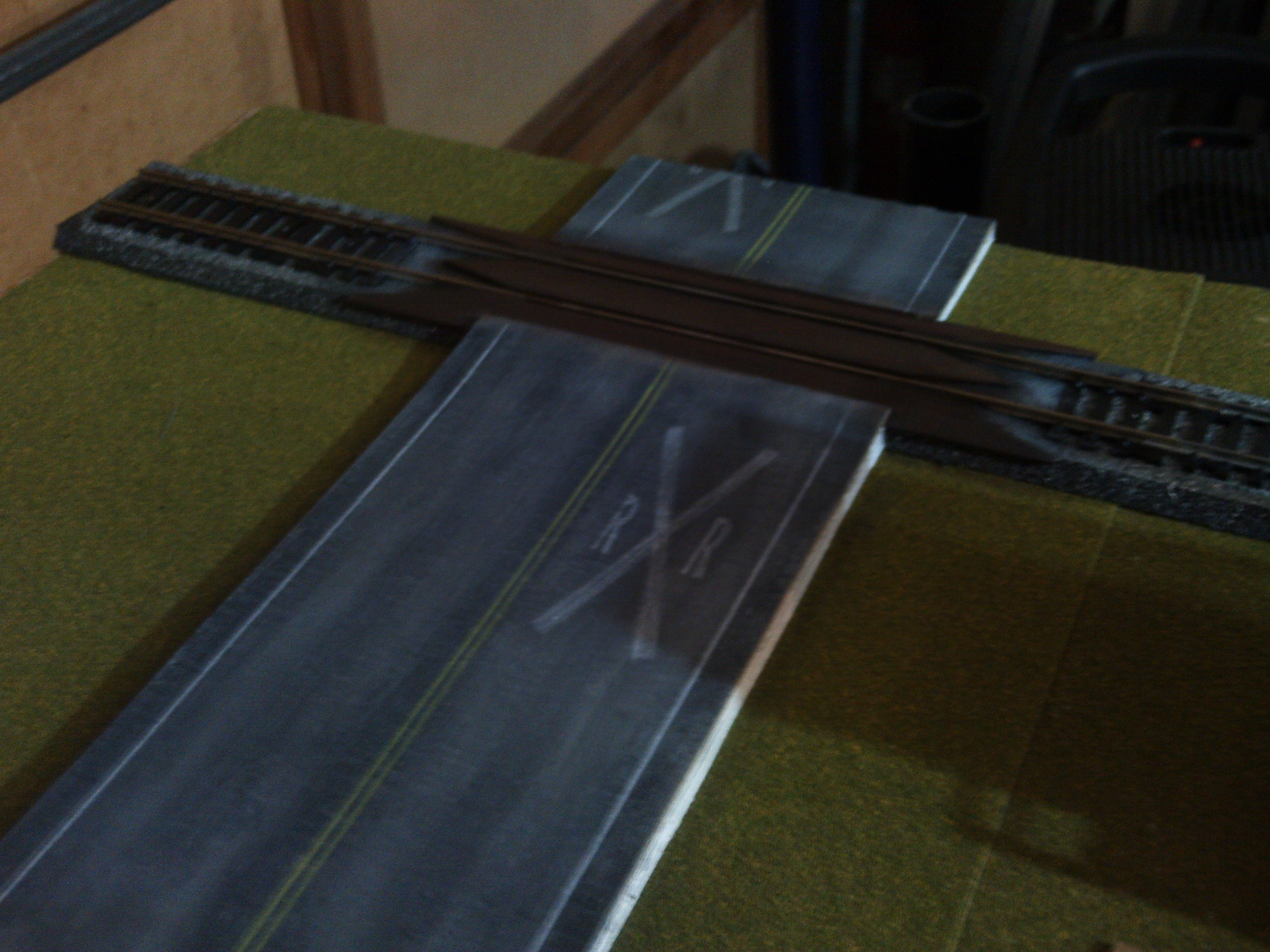 I striped the road using Prismacolor colored pencils. I made a stencil for the RR crossing sign on the pavement from a PDF on street markings I downloaded from Model Railroader's website a few years ago when they ran a more recent article about making roads.
